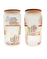 16 oz. Frosted glass tumbler with a full bookshelf wrap.